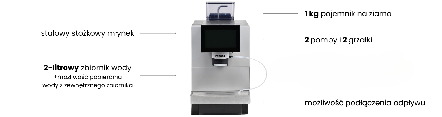 Fresco X80 Plus to sprawdzone rozwiązania znane z jego poprzednika - Fresco X80, wzbogacone o możliwość podłączenia do wody z sieci, odpływu do kanalizacji oraz opcjonalnie zrzutu fusów bezpośrednio do pojemnika.