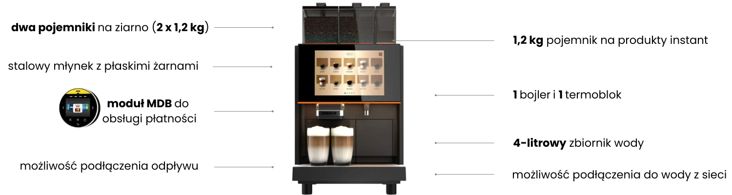 | Dodatkowe informacje | Możliwość wgrania filmów reklamowych, zmiana koloru podświetlenia pojemników i obudowy, ekspres wyposażony w 2 młynki |